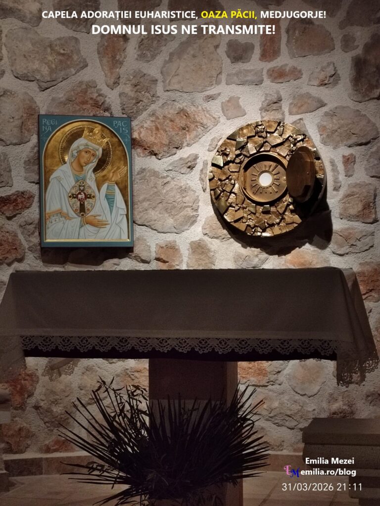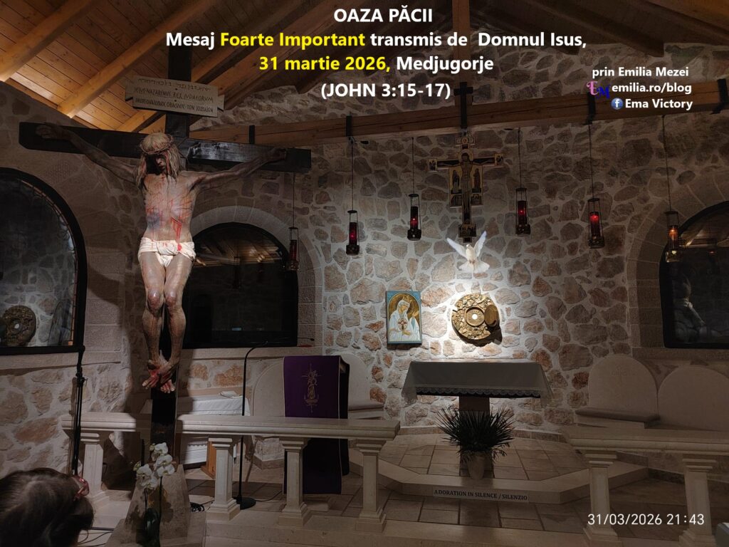Mesaj Foarte Important transmis de Domnul Isus, marți, 31 martie 2026, în Capela Adorației Euharistice Oaza Păcii din Medjugorje, în jurul orei 21:15, în Săptămîna Mare, ultima zi din luna martie, Domnul nostru Isus Cristos, Regele Omenirii, dorește ca să transmită un nou Mesaj prin mine.